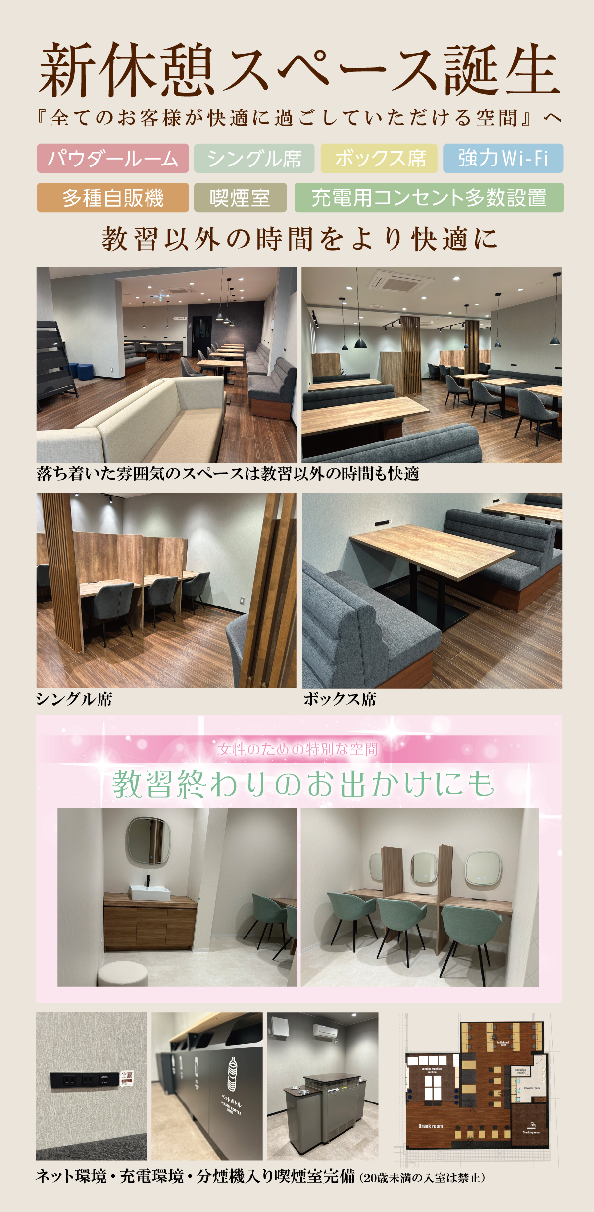 シングル席、ボックス席、女性に嬉しいパウダールーム、強力Wi-fiとコンセントも充実で教習以外の時間も快適にくつろげます。